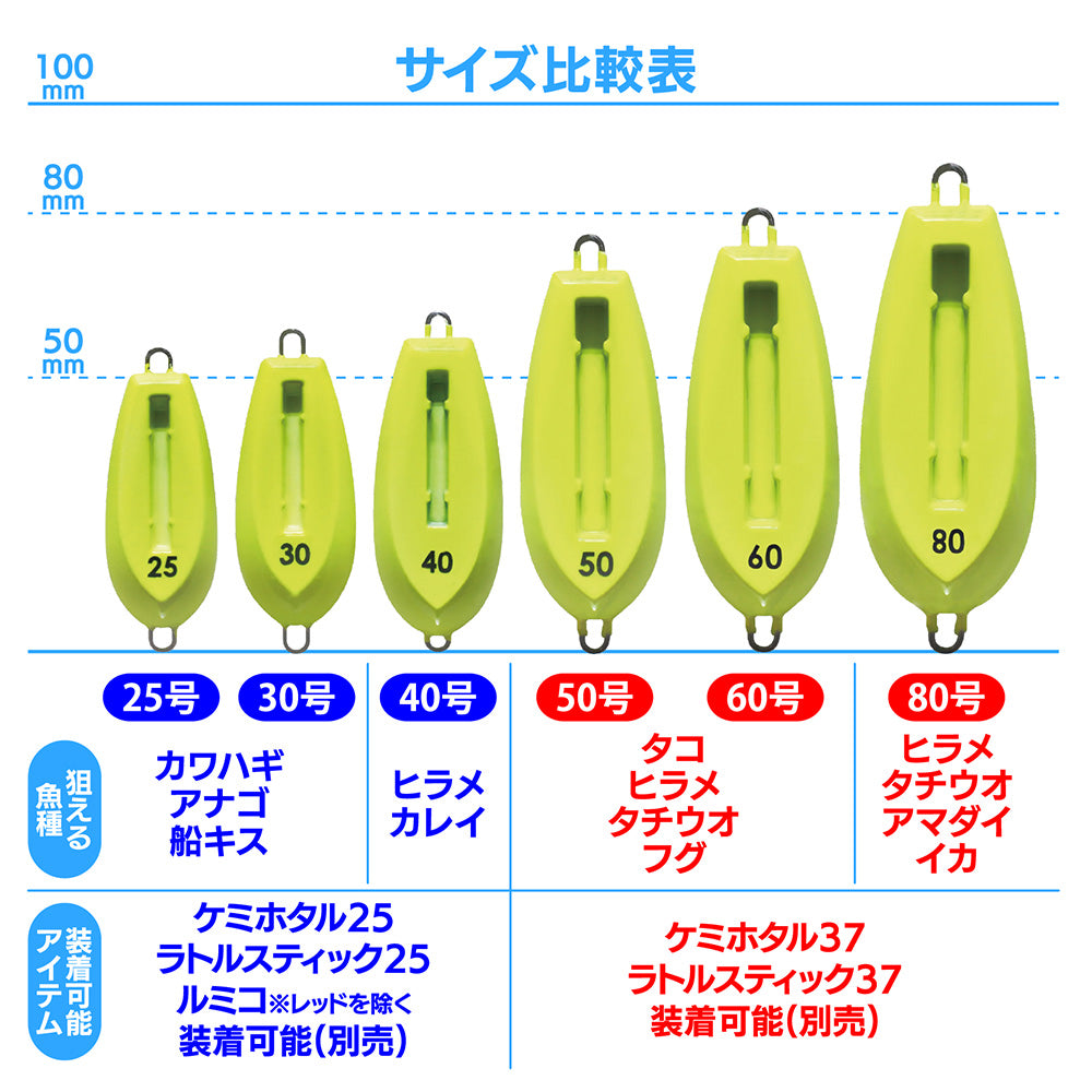 【25号〜40号 】 ケミホタル25/ラトルスティック25 【50号〜80号 】 ケミホタル37、ラトルスティック37、ルアーライト37 |